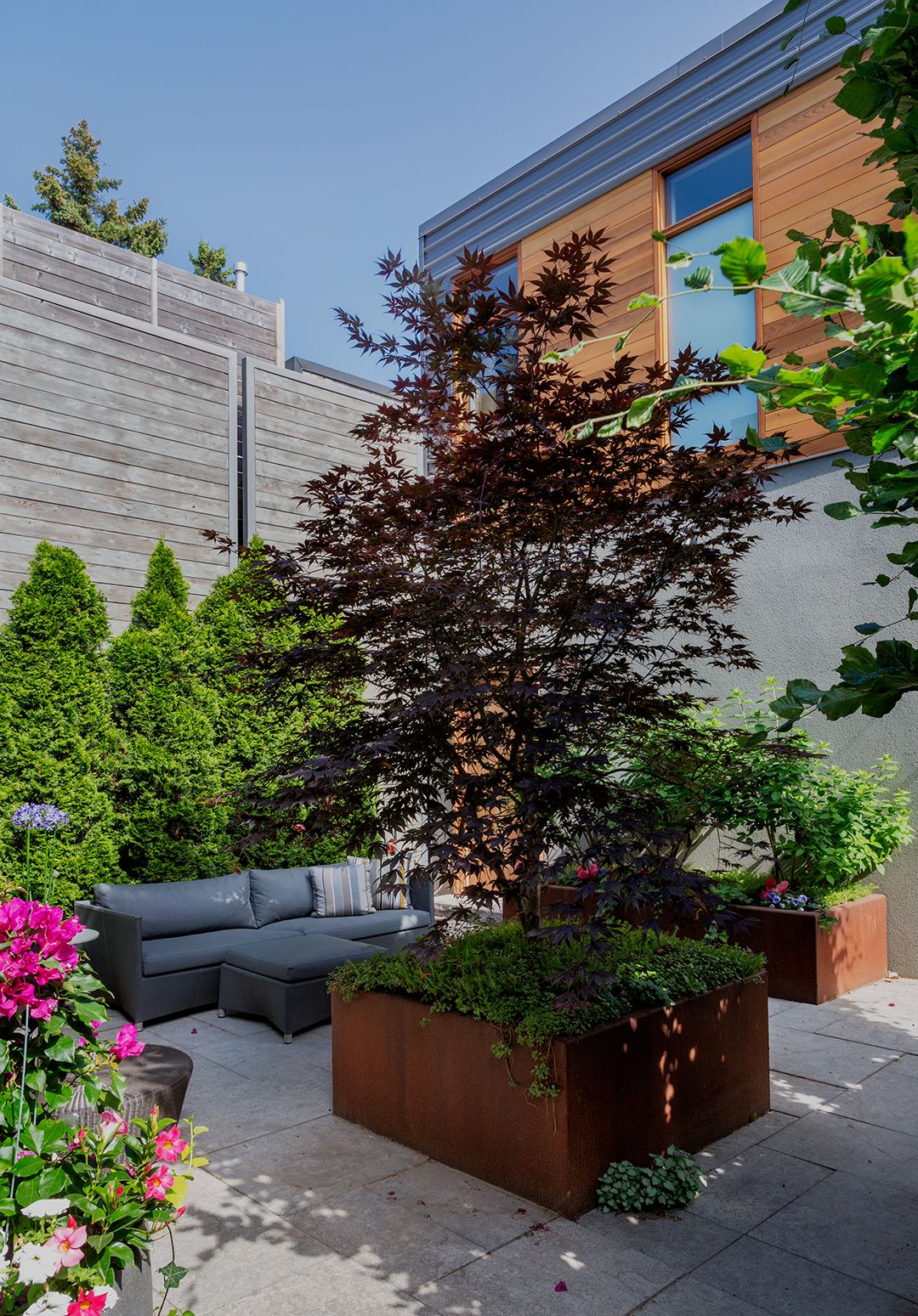 View of the garden with corten steel custom planters for a Japanese Maple and Limelight Hydrangea.