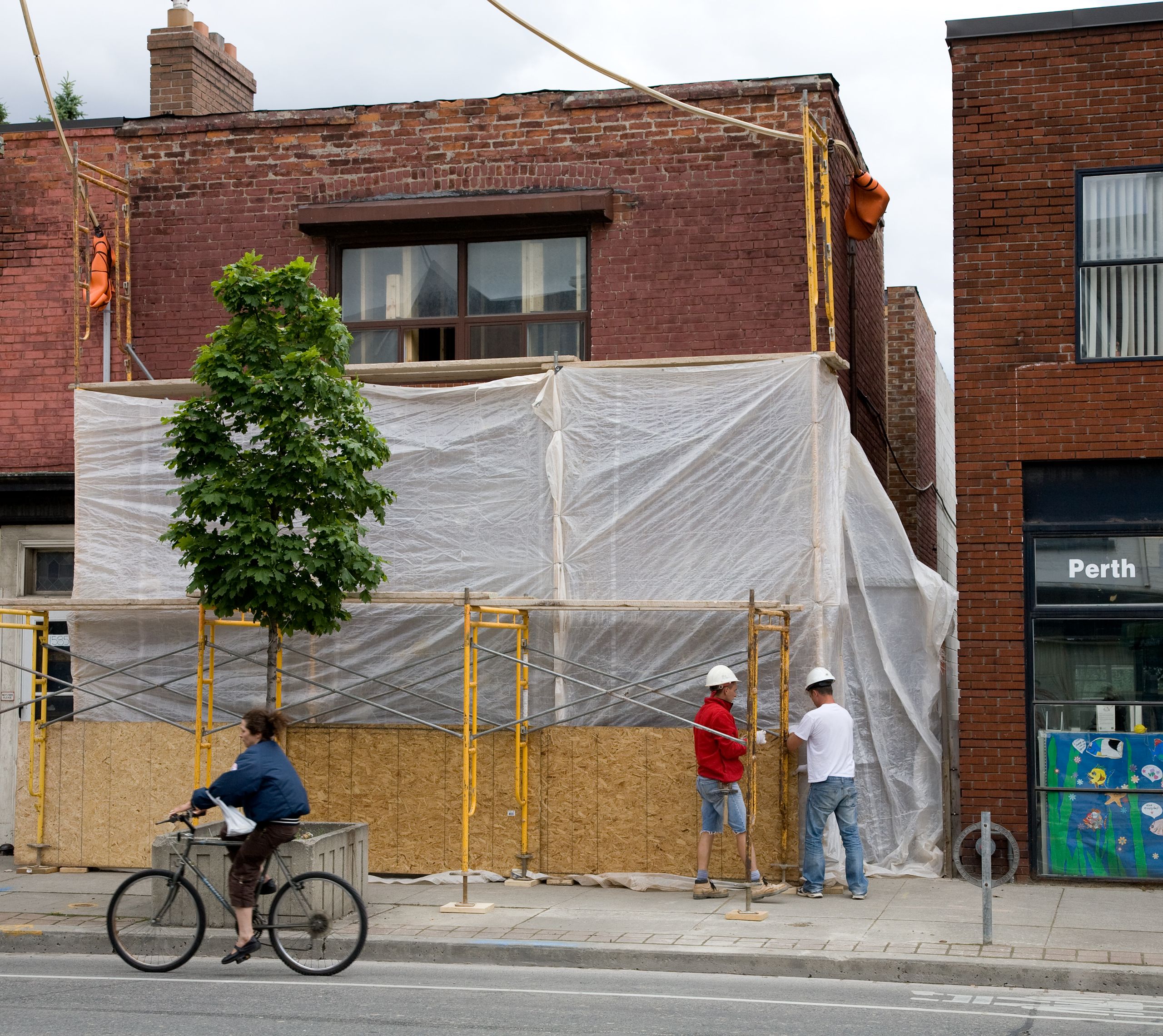 Tenting the facade and creating a walkway on a busy urban street.